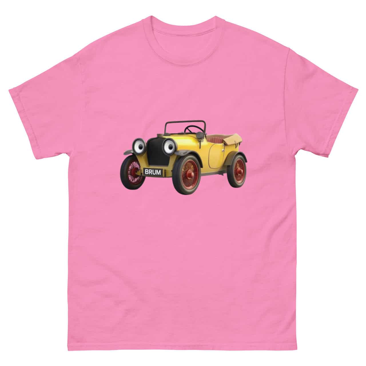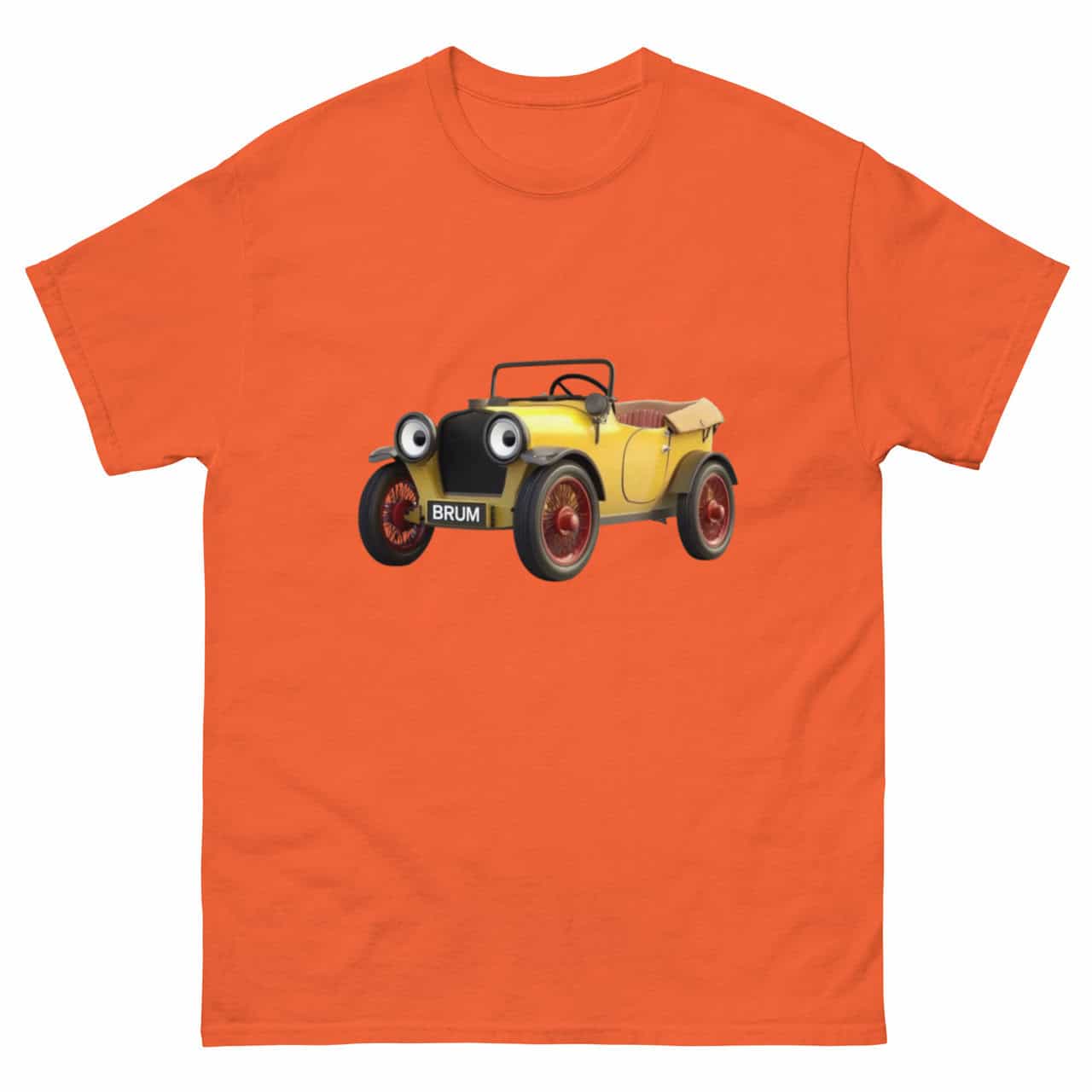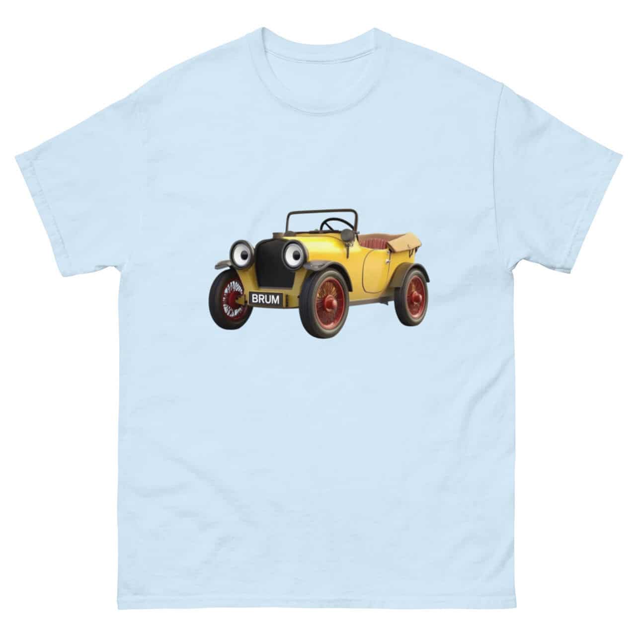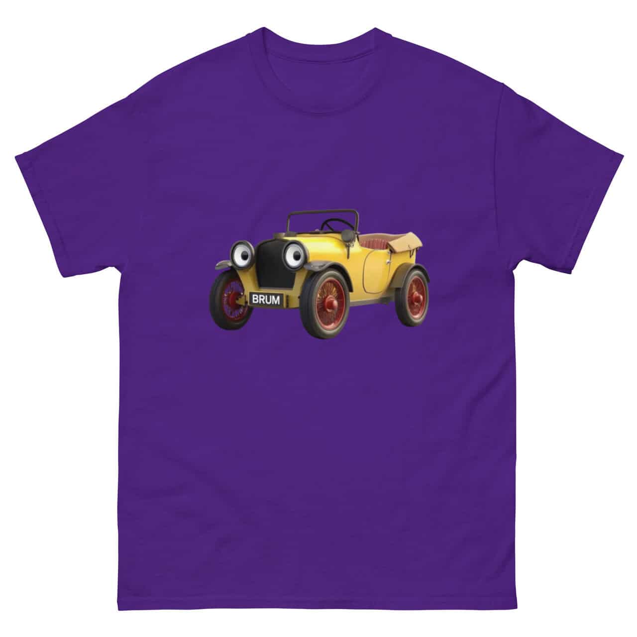 A highly detailed and realistic illustration of Brum, the much-loved yellow vintage car from the classic children’s TV show Brum, specifically designed for a Brum T-shirt. This Brum T-shirt design perfectly captures Brum’s iconic wide-eyed headlights, cheerful smile, and signature red wheels, making it an ideal choice for fans of all ages. The intricate details, including Brum’s distinctive number plate reading ‘BRUM,’ ensure this Brum T-shirt is instantly recognisable and nostalgic.